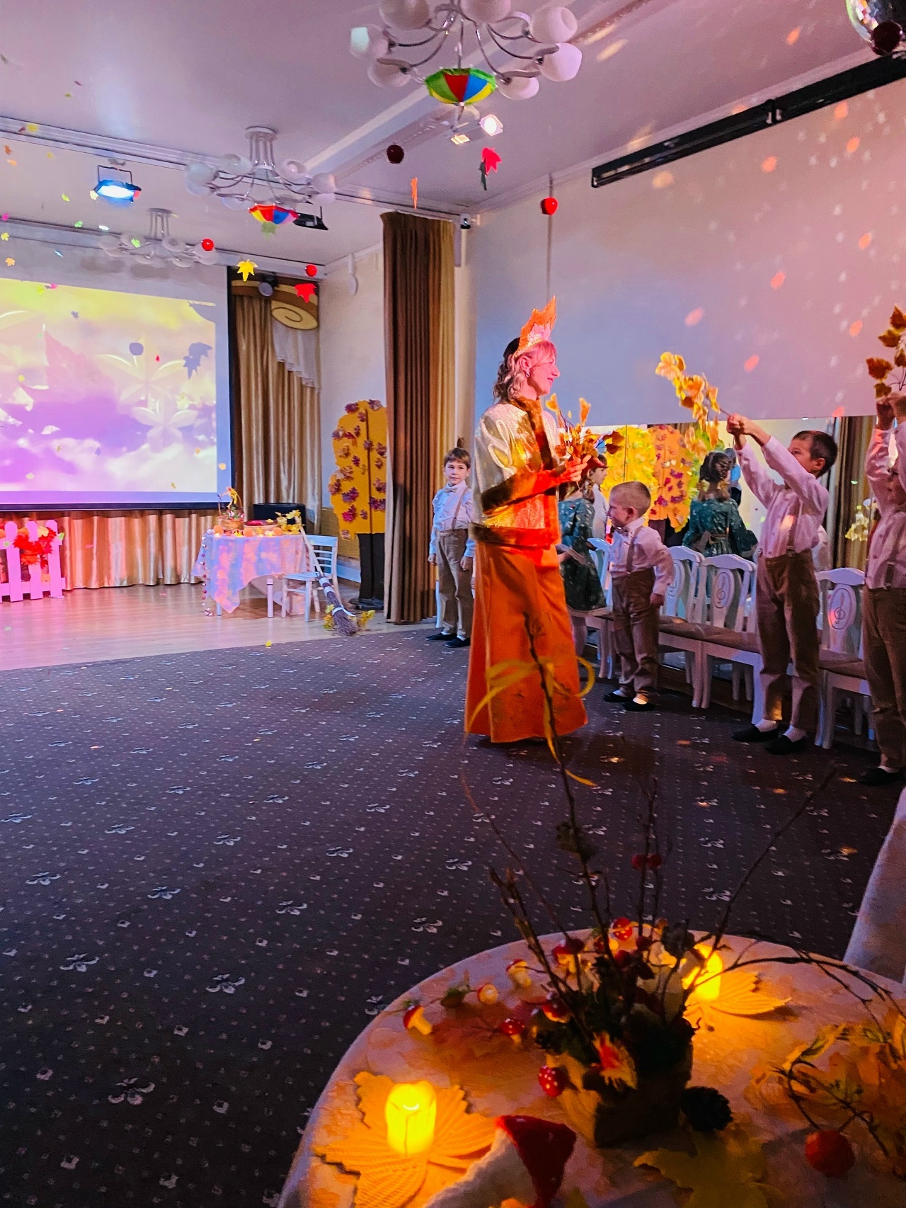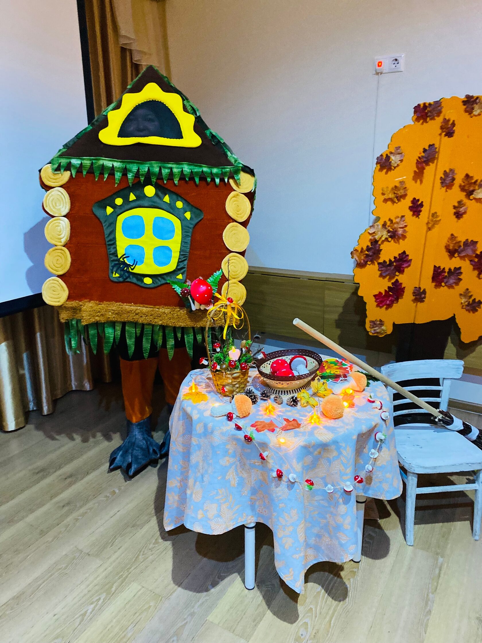 Каждая деталь была продумана с любовью: задорная избушка при встрече родителей, яркие костюмы, столики с мухоморами и теплыми огоньками.